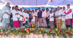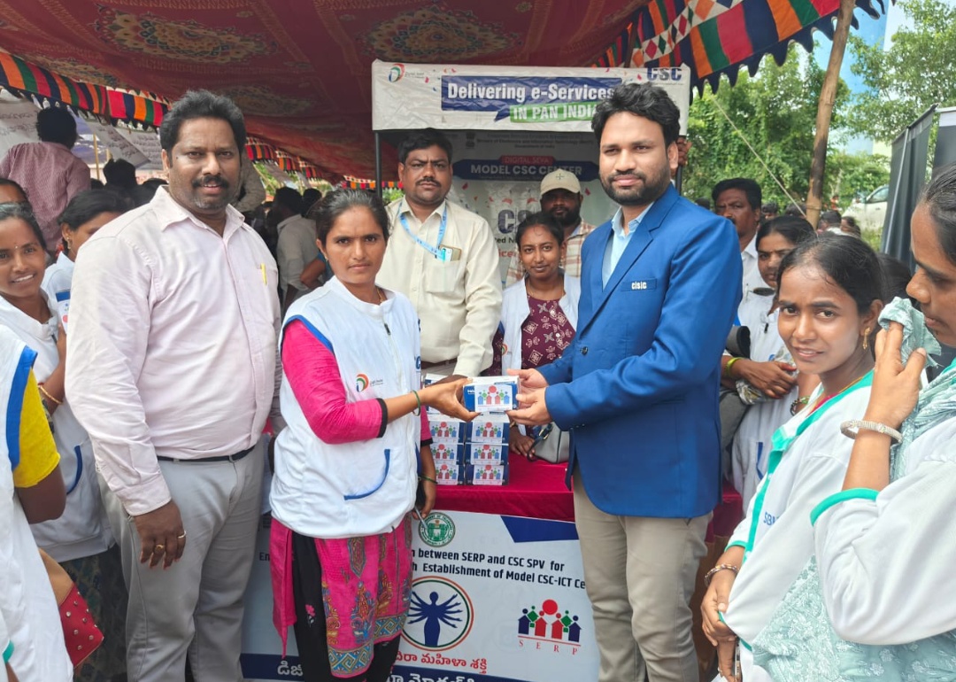 As part of the event, they distributed 153 biometric devices to SHG women managing Model CSCs and participated in a training session for the second batch of SHG VLEs at the IT Hub in Khammam.